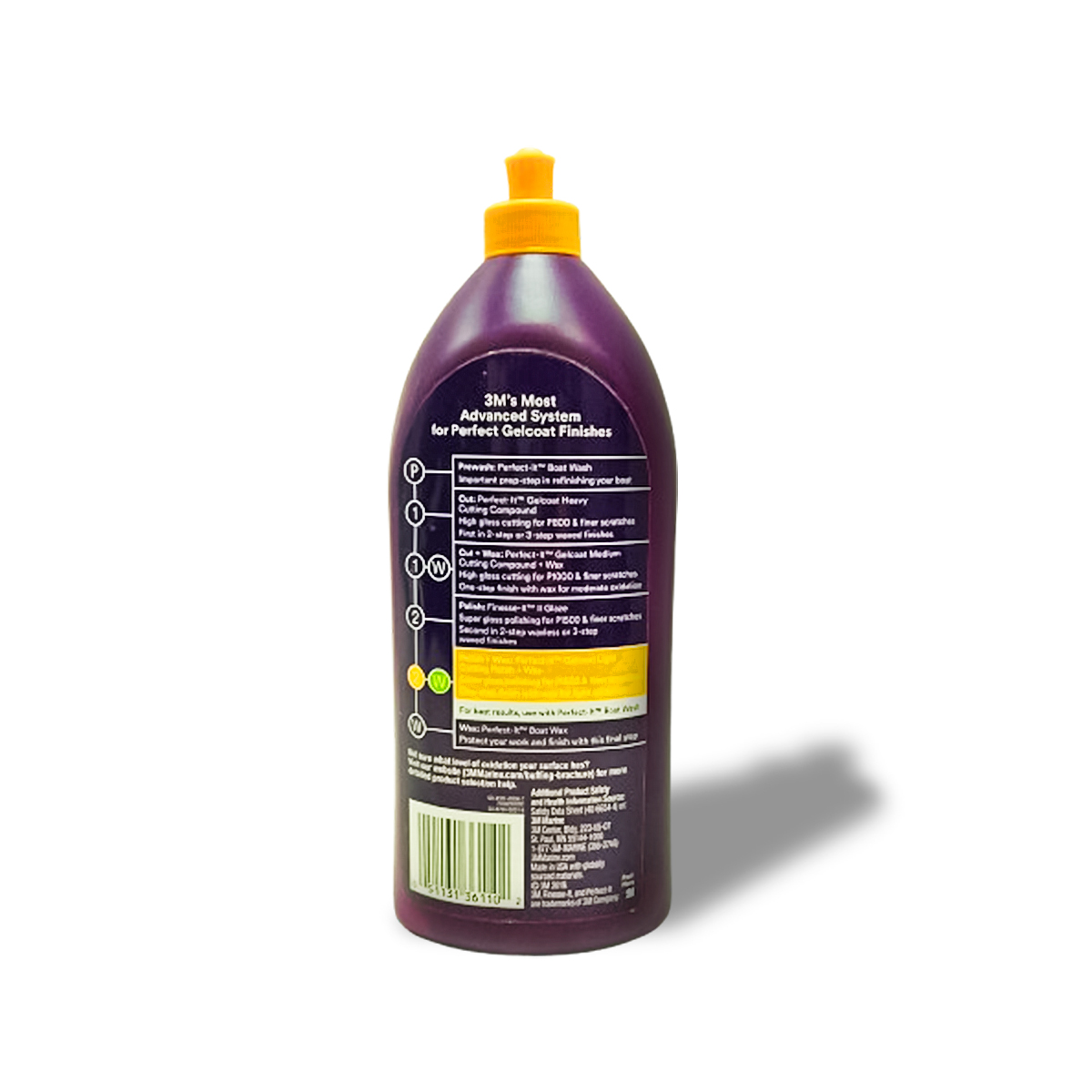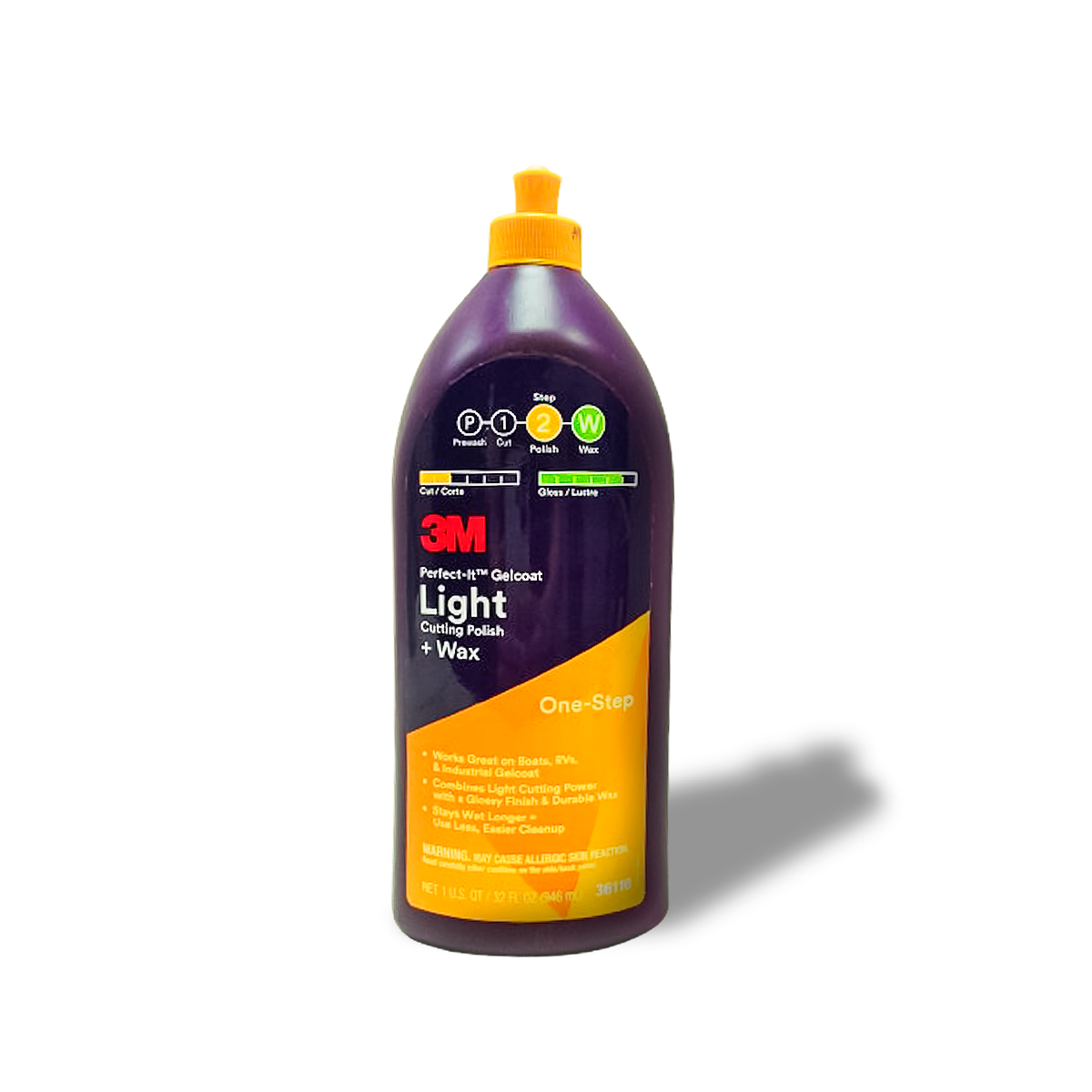 El pulimento + cera para corte ligero de gelcoat 3M™ Perfect-It™ está formulado para eliminar rápidamente la oxidación de ligera a media, rayones leves, marcas de remolino y otros defectos menores del gelcoat. Este pulimento elimina rayones de P1500 o más finos y deja un acabado de cera pulido sin remolinos, incluso en gelcoats oscuros difíciles.