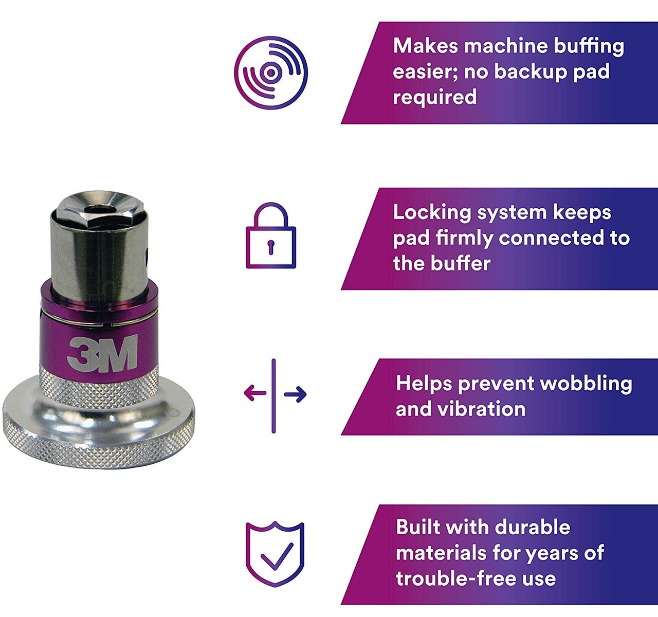 Se debe utilizar con borlas para pulido y borlas para lijado marca 3M™ Perfect-It™. Centra las borlas para utilizarlas con mayor eficiencia. Facilita el intercambio de las borlas para pulido y las borlas para lijado.