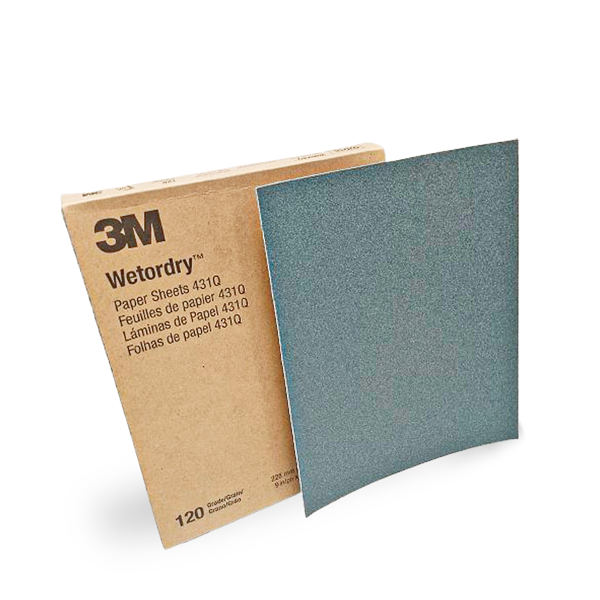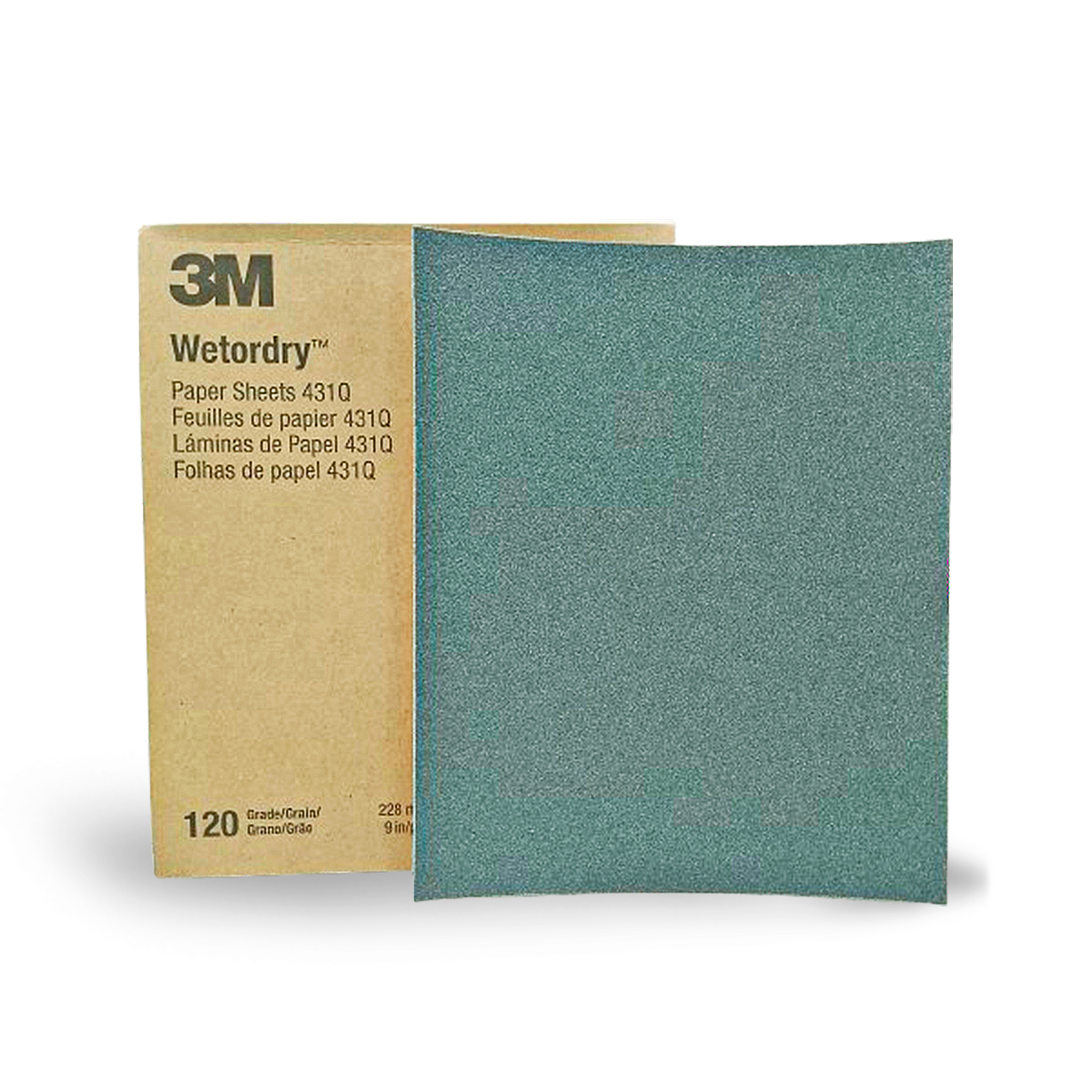 La hoja de papel 3M™ Wetordry™ 431Q cuenta con carburo de silicio de corte extra rápido sobre un soporte de papel resistente, impermeable y de peso C para brindar un acabado superior para aplicaciones húmedas y secas en una variedad de sustratos, que incluyen pintura, imprimación, gel coat, metal y madera.