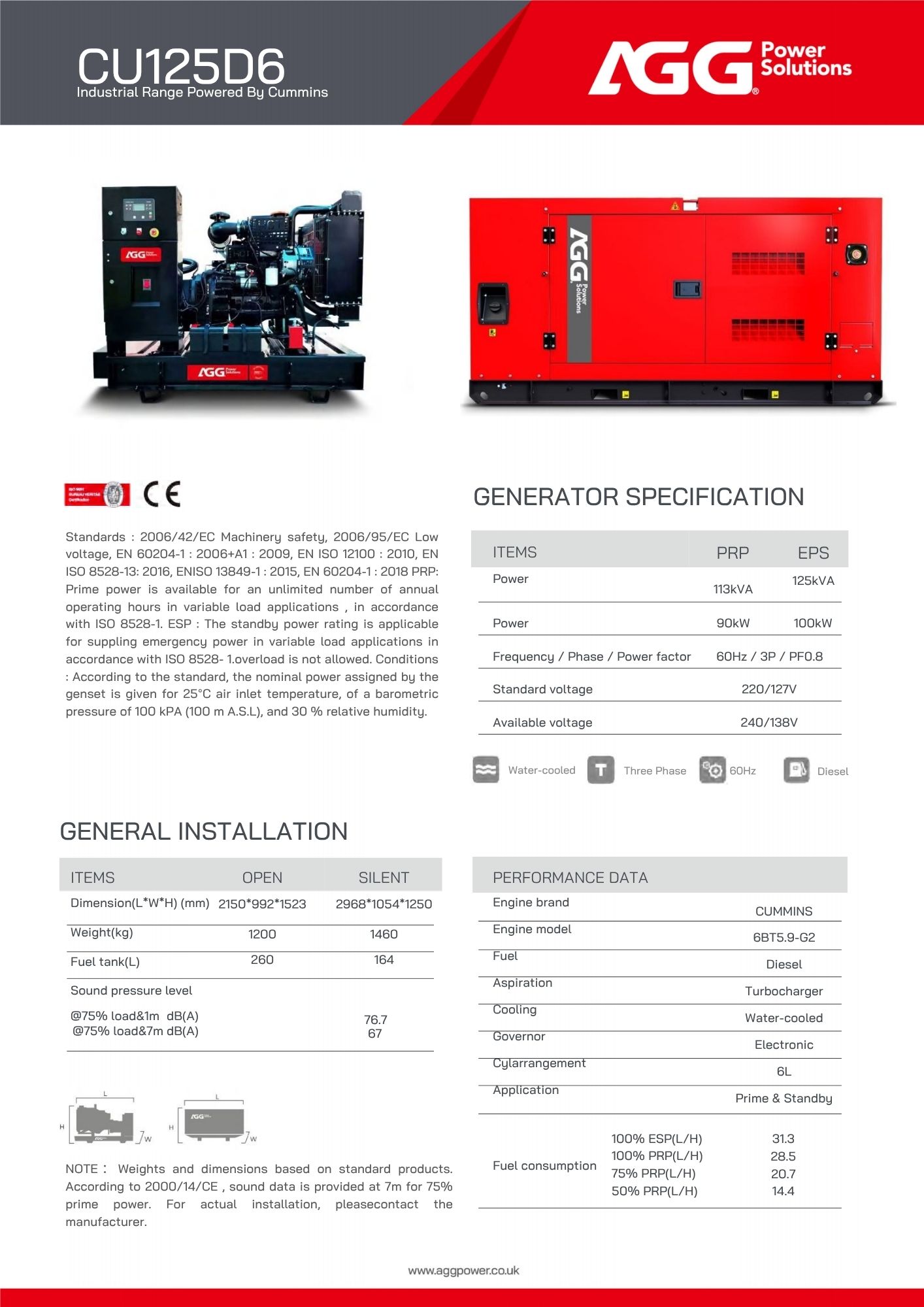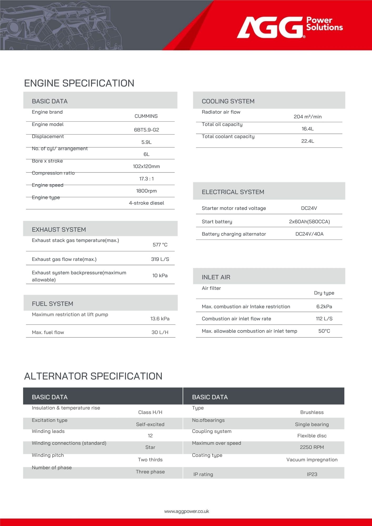 AGG Power Solutions, es una empresa multinacional de origen inglés, enfocada en el diseño, manufactura y distribución de sistemas de generadores y soluciones avanzadas de energía. AGG fabrica sus propios motores AGG y mantiene asociación comercial con Cummins, Perkins y Volvo entre otras. Todos los generadores cuentan con 1 año de garantía o 1.500 horas de uso con respaldo en repuestos, kit de mantenimiento y posventa.