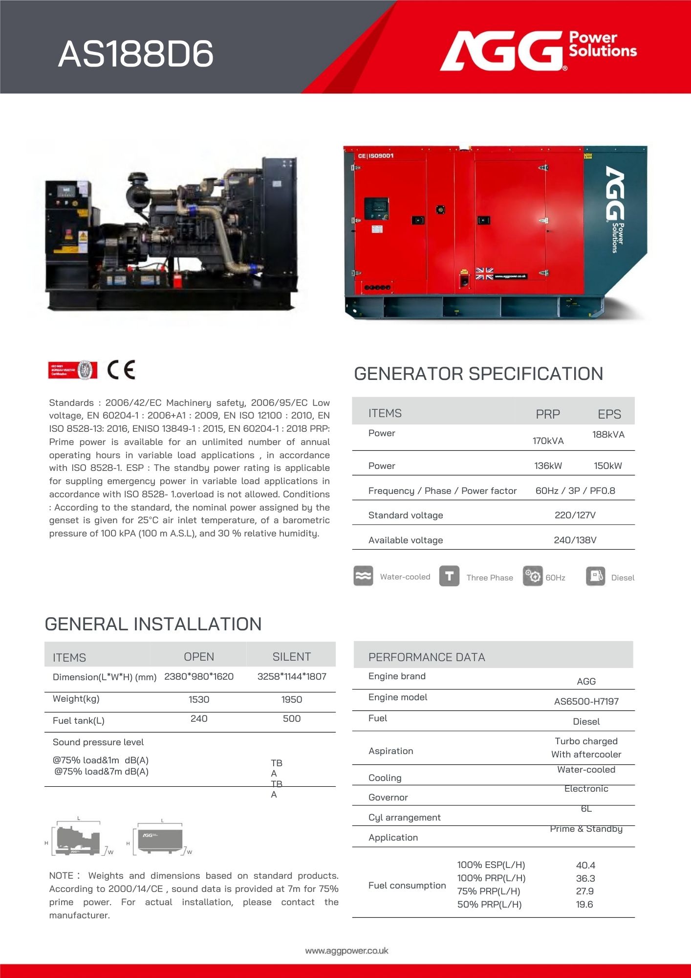 AGG Power Solutions, es una empresa multinacional de origen inglés, enfocada en el diseño, manufactura y distribución de sistemas de generadores y soluciones avanzadas de energía. AGG fabrica sus propios motores AGG y mantiene asociación comercial con Cummins, Perkins y Volvo entre otras. Todos los generadores cuentan con 1 año de garantía o 1.500 horas de uso con respaldo en repuestos, kit de mantenimiento y posventa.