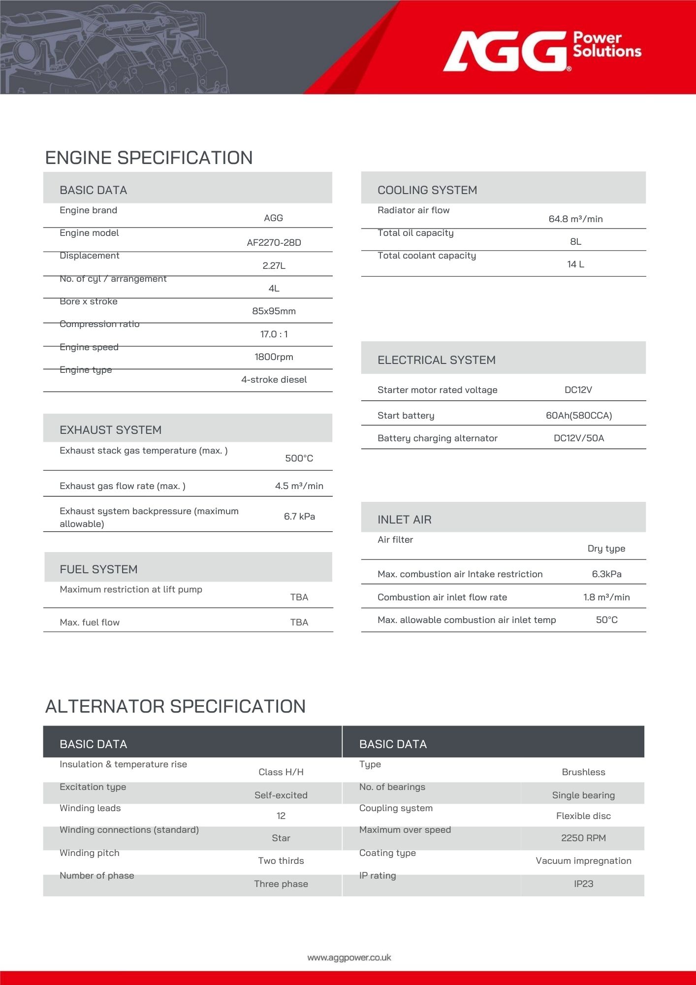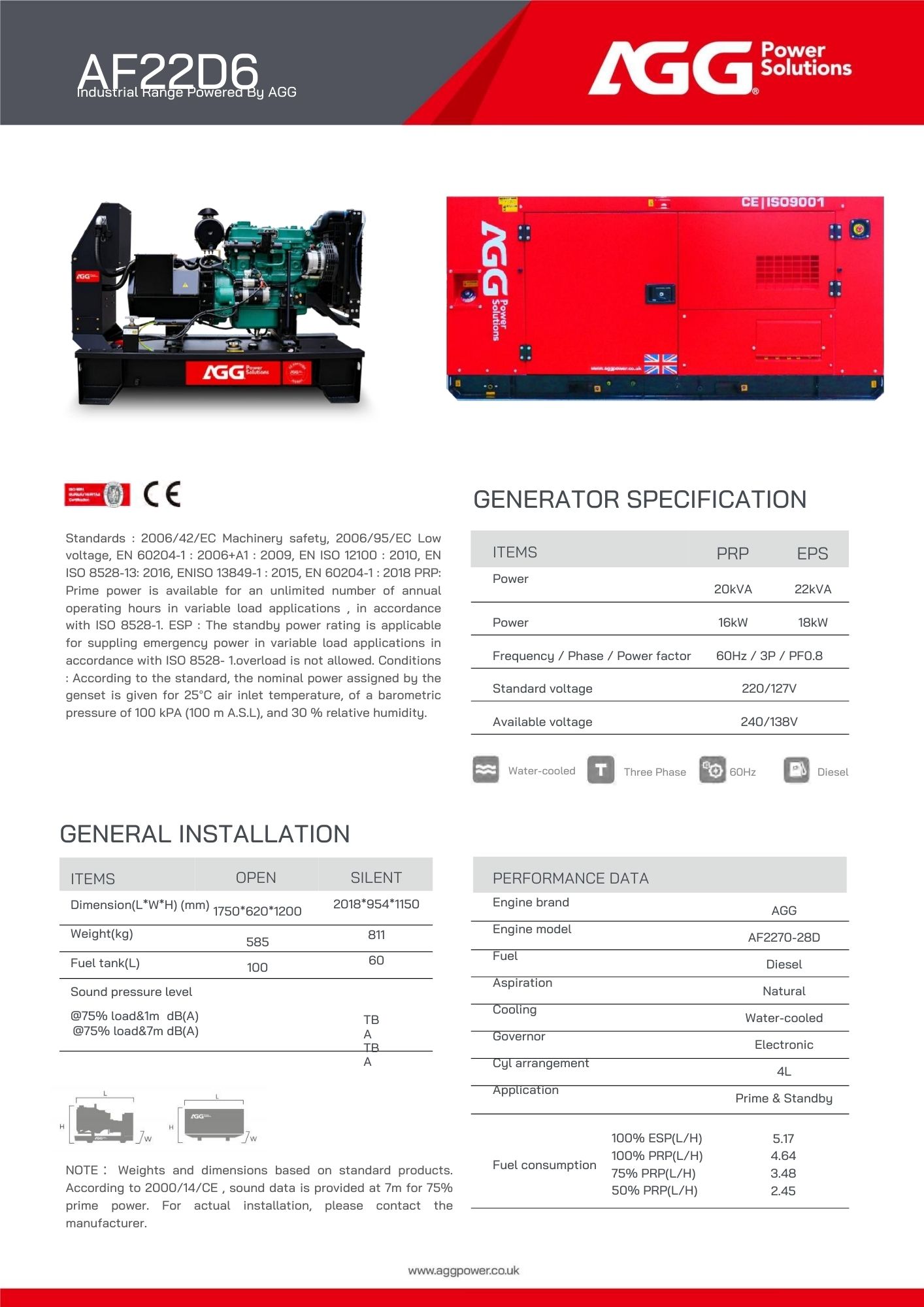 AGG Power Solutions, es una empresa multinacional de origen inglés, enfocada en el diseño, manufactura y distribución de sistemas de generadores y soluciones avanzadas de energía. AGG fabrica sus propios motores AGG y mantiene asociación comercial con Cummins, Perkins y Volvo entre otras. Todos los generadores cuentan con 1 año de garantía o 1.500 horas de uso con respaldo en repuestos, kit de mantenimiento y posventa.