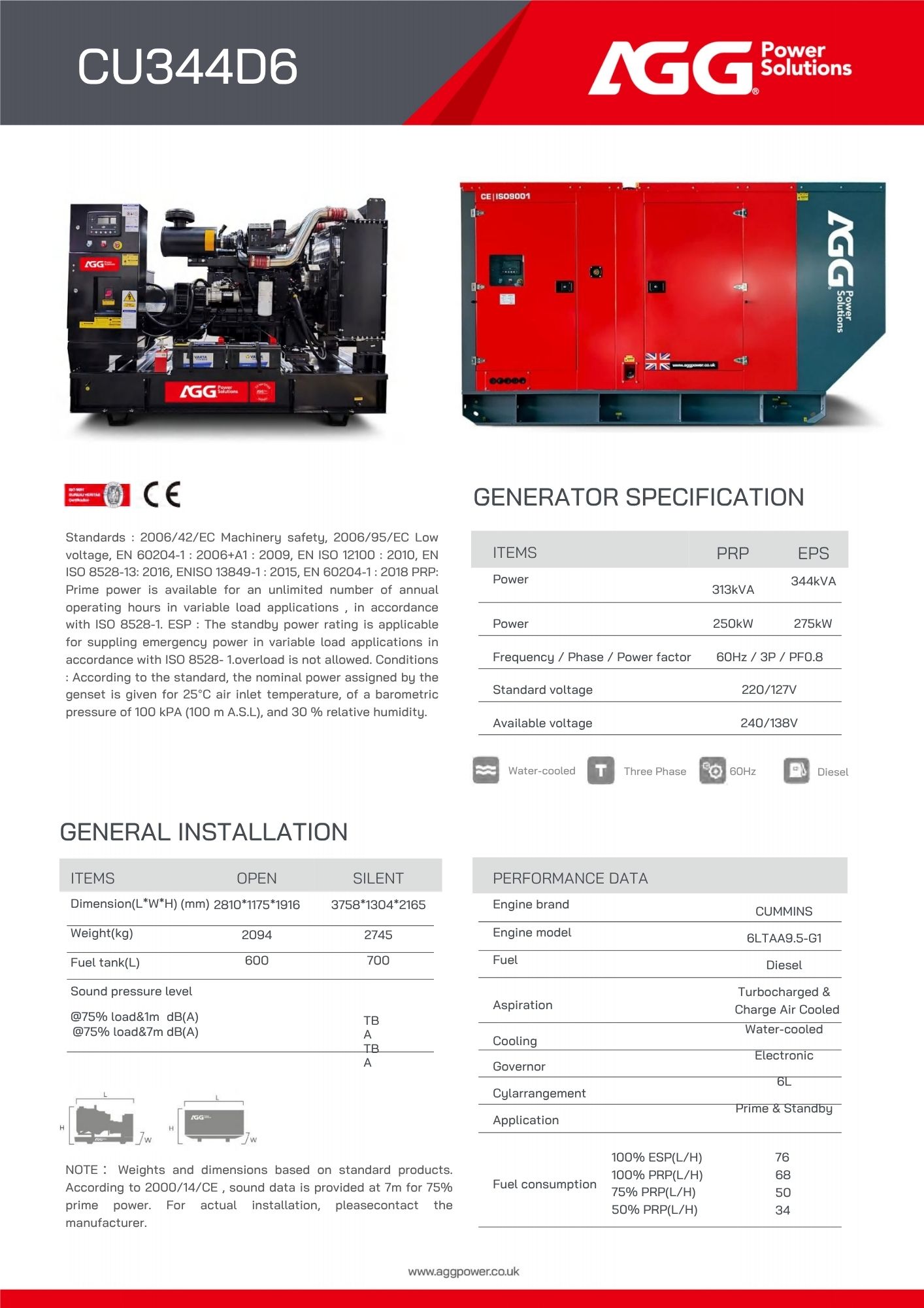 AGG Power Solutions, es una empresa multinacional de origen inglés, enfocada en el diseño, manufactura y distribución de sistemas de generadores y soluciones avanzadas de energía. AGG fabrica sus propios motores AGG y mantiene asociación comercial con Cummins, Perkins y Volvo entre otras. Todos los generadores cuentan con 1 año de garantía o 1.500 horas de uso con respaldo en repuestos, kit de mantenimiento y posventa.