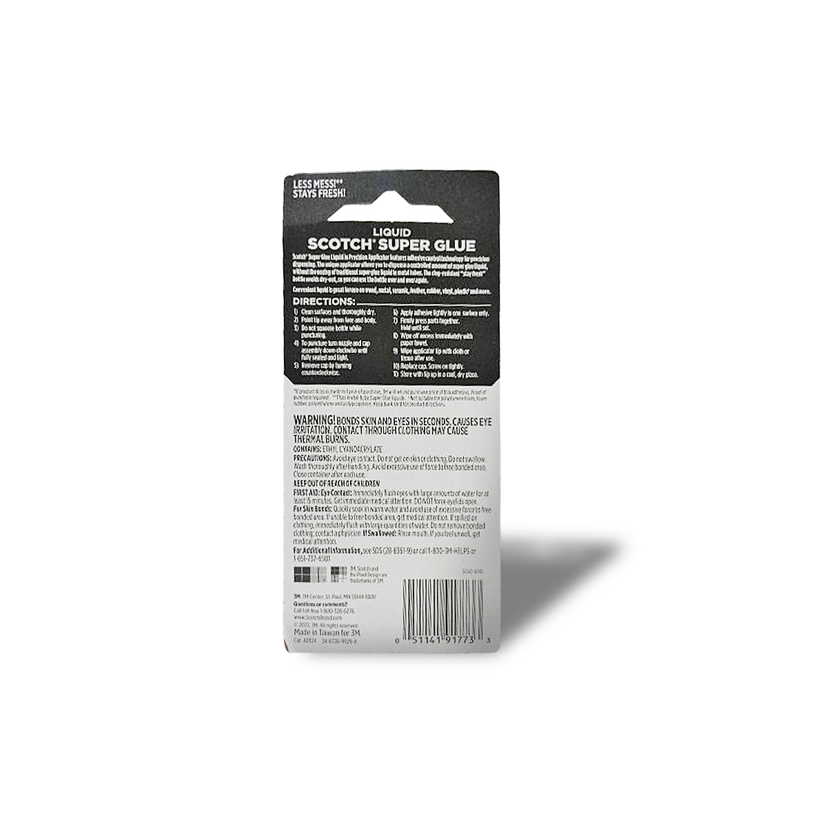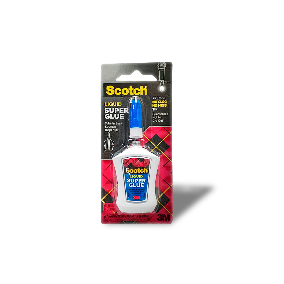 El Super Glue Líquido Scotch® en Aplicador de Precisión cuenta con tecnología patentada de control de gotas para una dispensación precisa. Su botella resistente a obstrucciones y con un acabado que mantiene la frescura, evita que se seque, lo que permite reutilizarla una y otra vez. Úselo en madera, metal, cerámica, cuero, goma, vinilo, algunos plásticos y más.