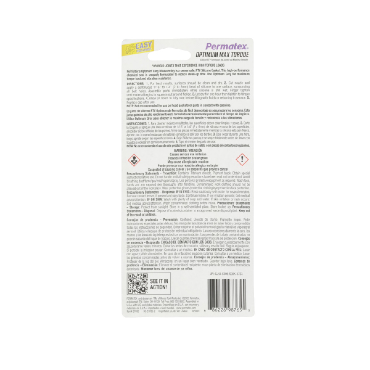 El sellador Permatex Optimum Gris ahora cuenta con la función Easy-Disassembly para reducir el tiempo de desmontaje del motor o sus componentes. Aplique Optimum Easy-Disassembly como de costumbre y al desmontar solo tendrá que aflojar las piezas y retirar el sellador con los dedos. ¡Así de fácil! Permatex Optimum Easy-Disassembly sella firmemente y se retira rápidamente. Diseñado para soportar la máxima carga de torque y resistencia a las vibraciones; se utiliza comúnmente en vehículos importados con menor distancia entre tornillos. El sellador Permatex Optimum Easy-Disassembly Gris es la opción premium para refrigerantes, especialmente después de la introducción de DEX-COOL. Utilice Permatex Optimum Gris en aplicaciones con alta vibración y alto torque, como tapas de válvulas, bombas de agua, sellos de los extremos del colector de admisión y carcasas de termostato.